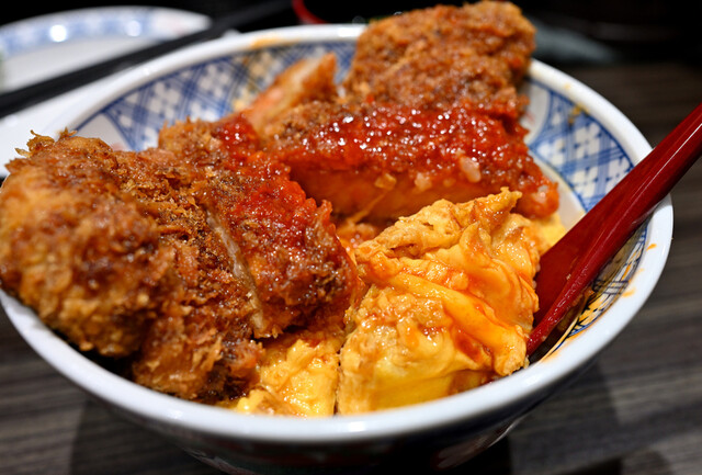 Katsudon là cơm với miếng thịt heo hoặc gà katsu chiên giòn, sau đó nấu cùng nước dùng dashi ngọt pha nước tương, hành tây thái mỏng và trứng đánh tan.